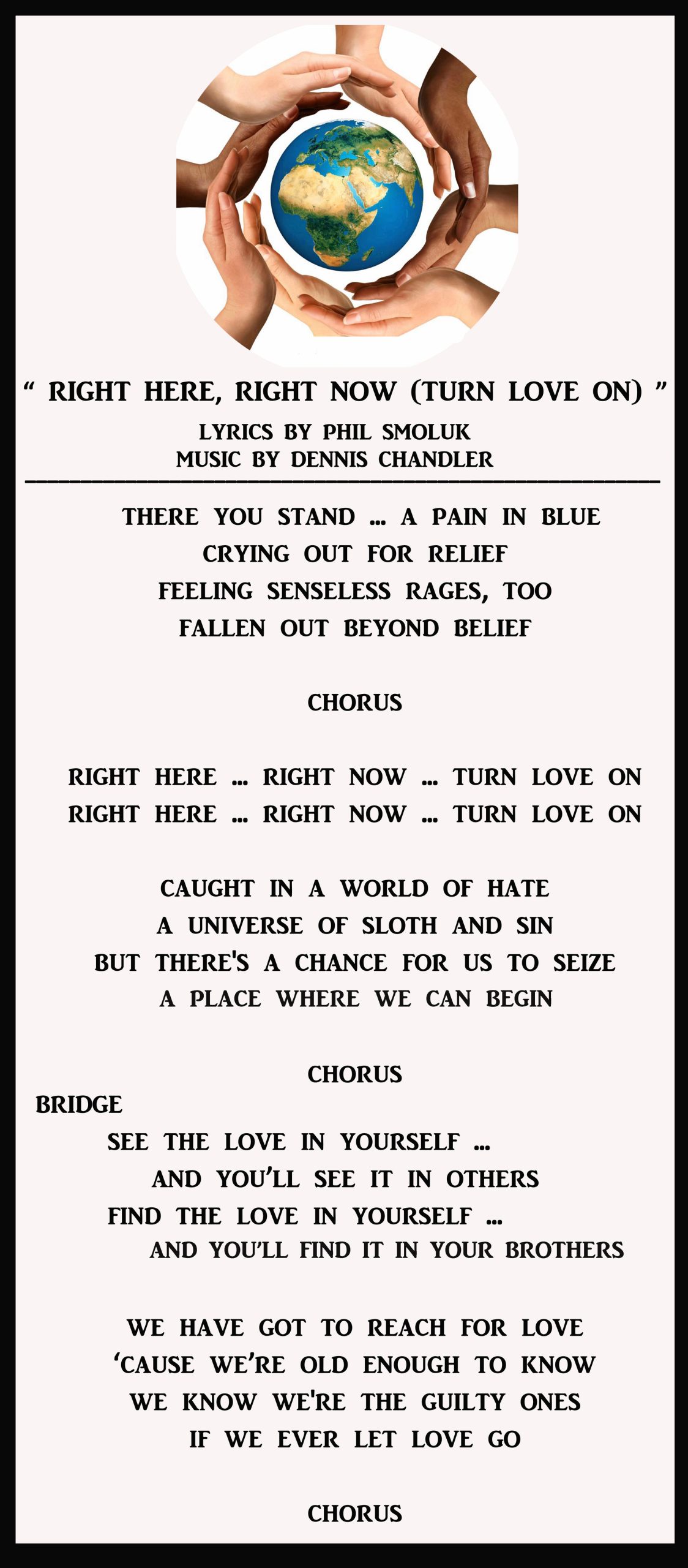 DENNIS CHANDLER PHIL SMOLUK ORIGINAL SONG RIGHT HERE RIGHT NOW TURN LOVE ON LYRIC SHEET –